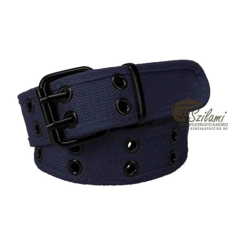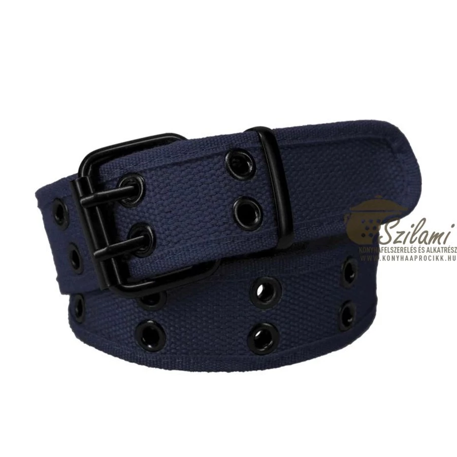 A dupla lyukazás a sötétkék vászon derékszíj teljes hosszában végigfut.