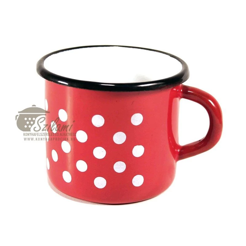 Kisméretű zománcozott piros pöttyös bonyhádi bögre.